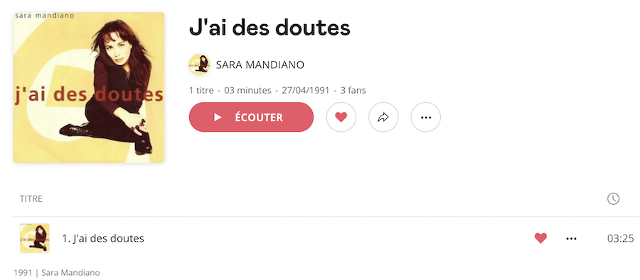 Surprise en cette fin d’année 2022 de voir apparaître sur les plateformes de streaming et de téléchargement le titre J’ai des doutes, 31 ans après sa sortie en avril 1991 ! Une bonne nouvelle qui, je l’espère, annonce d’autres sorties (c’est pour l’instant le seul et unique titre de Sara disponible en ligne légalement).