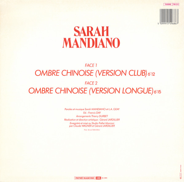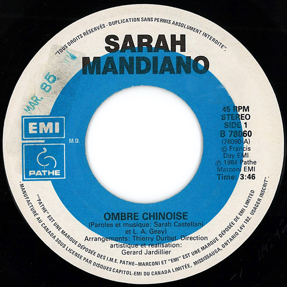 Tout premier 45 tours de Sarah Mandiano (qui s’écrit alors avec un « h »), Ombre chinoise est une chanson écrite et composée avec le complice Lionel-Axel Geay, tout comme sa face B Porte des chambres.