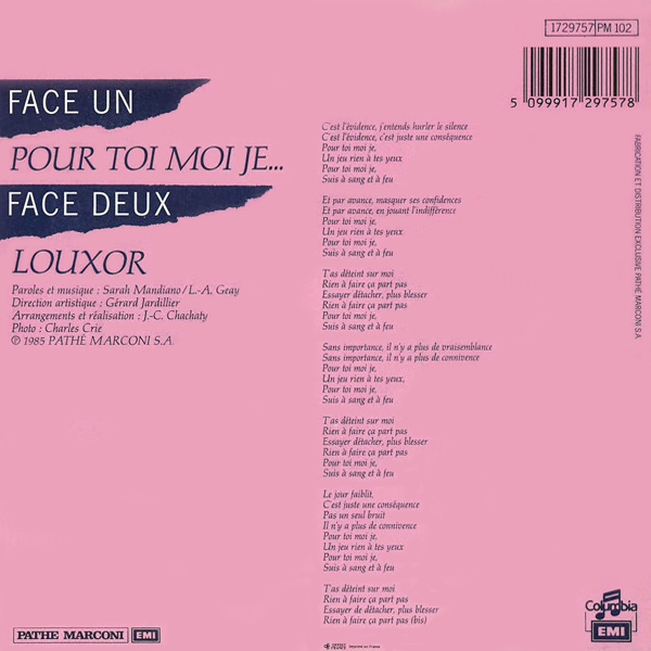 Sur la face B, un morceau complètement différent mais non moins bon, qui nous emmène cette fois en Afrique, plus précisément à Louxor (d’après sa biographie japonaise Sarah a voyagé au Moyen-Orient et est très attirée par l’Égypte). L’ambiance y est beaucoup plus rock, et la guitare électrique s’en donne à cœur joie. J’aime particulièrement les refrains et le pont musical, très réussis. Course-poursuite malheureuse d’un amoureux transi débarqué en Égypte et traquant en vain sa « reine de Saba » qui se refuse immanquablement à lui, Louxor est l’autre facette de Pour toi moi je… et cette fois c’est l’homme qui souffre.